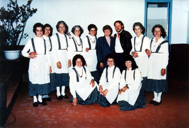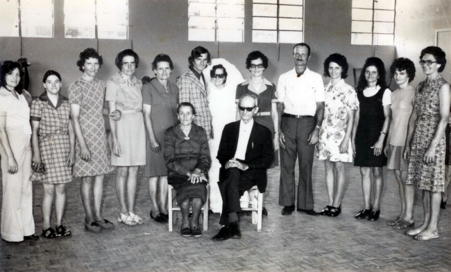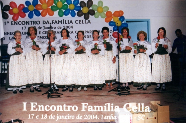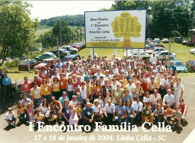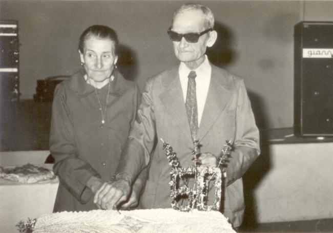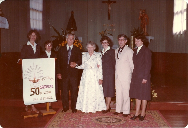 Jubileu de Ouro de Antônio Cella e esposa. Ele é filho do Antônio Cella; portanto, neto de Andréa Cella e Mariana Parpinelli. Aparecem na foto, as três filhas freiras, Irmãs Franciscanas da Congregação “Nossa Senhora Medianeira”.